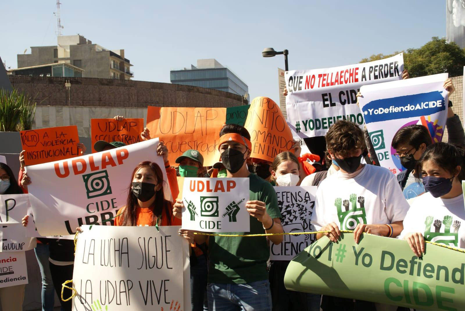 Los estudiantes marcharon con carteles con las leyendas “extraño mi vida universitaria”, “Udlap y CIDE libres” y con las consignas “Álvarez Buylla, la ciencia no es tuya” y “más ciencia y menos obediencia”.