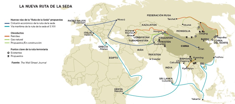 En 2013, Xi Jinping, presidente de China, anunció que su país tomaría la iniciativa para construir un gran corredor comercial que comunicara a China con Europa, pasando por todos los países intermedios. Su nombre oficial es “Una Franja, Una Ruta”, sin embargo, se le conoce más como la “Nueva Ruta de la Seda” por su eminente parecido con la antigua red comercial. Los objetivos de este plan no son desconocidos para nadie: se trata de ampliar la zona de influencia de China. El poderoso Estado gobernado por el Partido Comunista ejerce ahora una incuestionable hegemonía en el sudeste asiático, pero el crecimiento económico que ha sostenido en las últimas décadas le ha dado a China la capacidad suficiente para expandirse a espacios más lejanos. Con la Nueva Ruta de la Seda, China se proyecta como un firme competidor que le disputa a Estados Unidos la hegemonía no de Asia, sino del mundo.