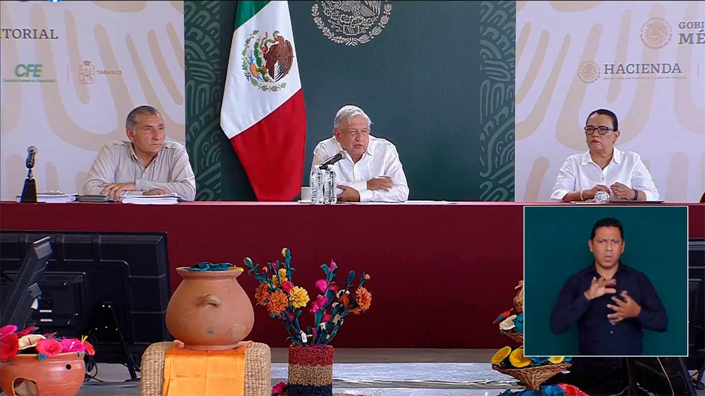 Este lunes el mandatario estuvo en Villahermosa, donde fue acompañado por integrantes del gabinete presidencial, entre ellos, la secretaria de Gobernación, Olga Sánchez Cordero y el secretario de la Defensa Nacional, el general Luis Crescencio Sandoval, además del gobernador constitucional de Tabasco, Adán Augusto López.