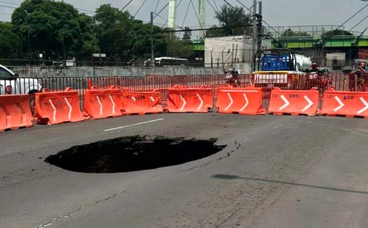 El socavón, ubicado entre las estaciones de Metro Canal de San Juan y Peñón Viejo (Línea A), ha sido confinado, no obstante, los carriles afectados permanecen cerrados, lo que ha generado congestionamiento en esta importante vialidad.