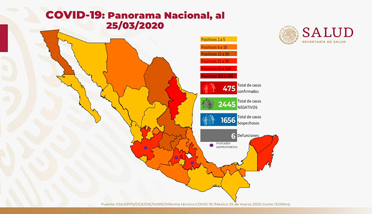 La Secretaría de Salud confirmó este miércoles que ya son 6 las personas fallecidas por el nuevo coronavirus COVID-19 en México. Además, los casos confirmados ascienden a 475.