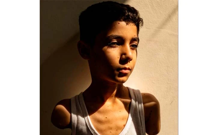 Asimismo, indicó que el menor retratado, Mahmoud, tiene sólo nueve años de edad, quien resultó herido al huir con su familia de un bombardeo en el pasado mes de marzo; fue al girarse, cuando intentó animarlos a correr, que una explosión lo alcanzó y por lo cual tuvieron que amputarle los brazos justo por debajo de los hombros.