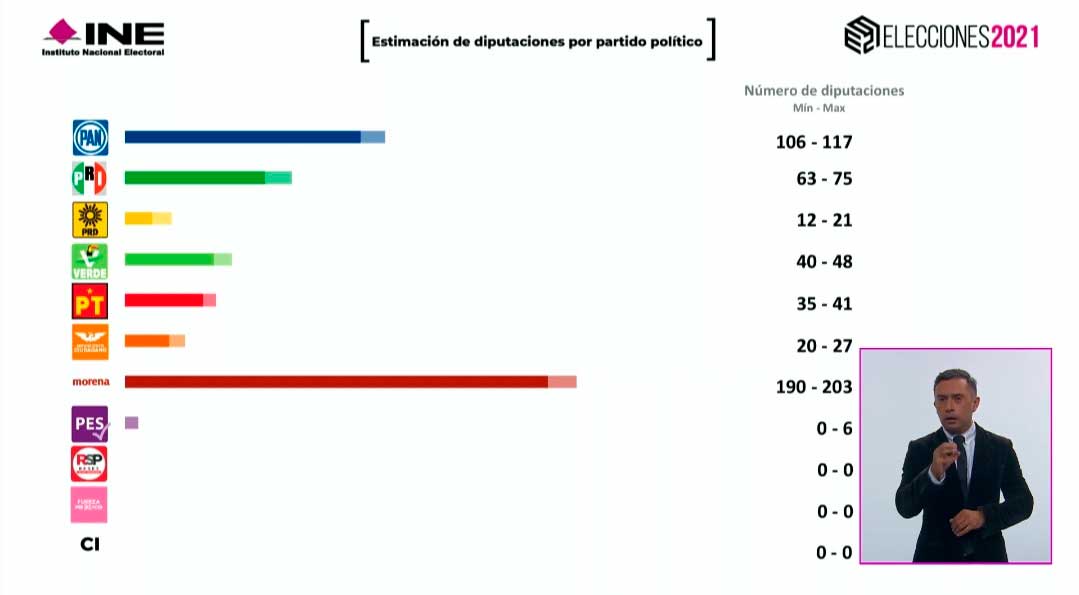 De acuerdo a los primeros resultados del PREP presentados por el Instituto Nacional Electoral (INE), el partido Morena tendrá entre 190 y 203 legisladores, por lo que, para ser mayoría en la Cámara de Diputados, requerirá de sus aliados del Verde Ecologista y el Partido del Trabajo.