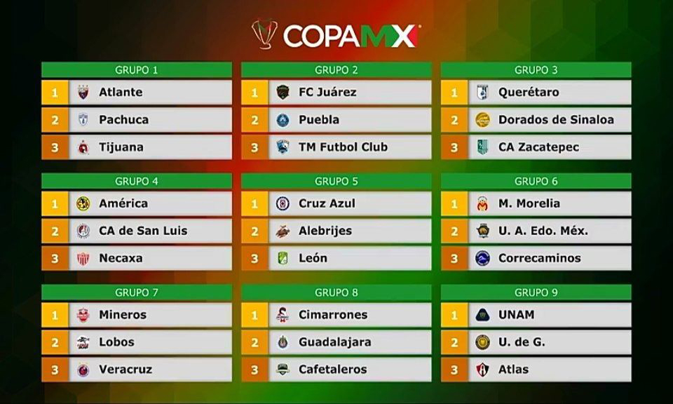 Ciudad de México. - Los grupos de la próxima Copa MX del Clausura 2019, que arrancará el próximo 8 de enero, quedaron definidos, con la participación de 27 clubes, 14 de Liga MX y 13 de Ascenso MX, distribuidos en nueve sectores.