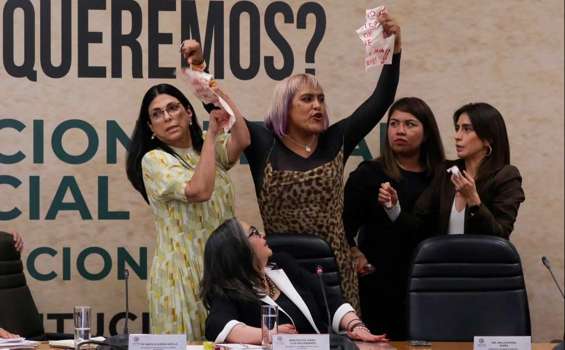María Clementina García ingreso gritando al salón donde se llevaba a cabo la discusión. La diputada portaba en la mano una cartulina en la que cuestionó el papel del juez que esta semana liberó al presunto autor del asesinato de Paola Buenrostro, una persona trans.