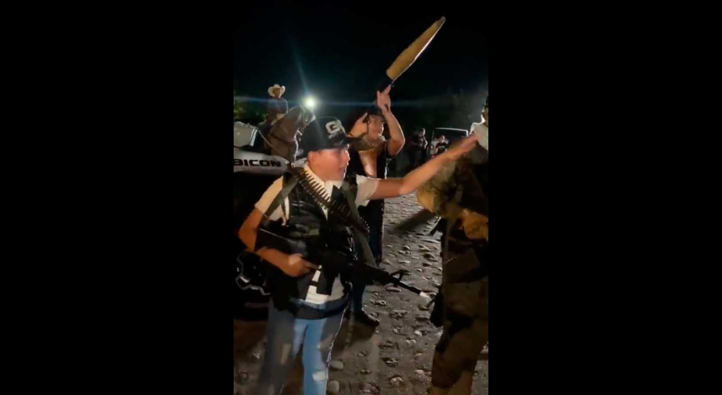 En otro video se aprecia a un sujeto con el rosto cubierto y portando una bazuca, además de un joven quien a manera de broma le apunta con un arma larga a uno de los uniformados.