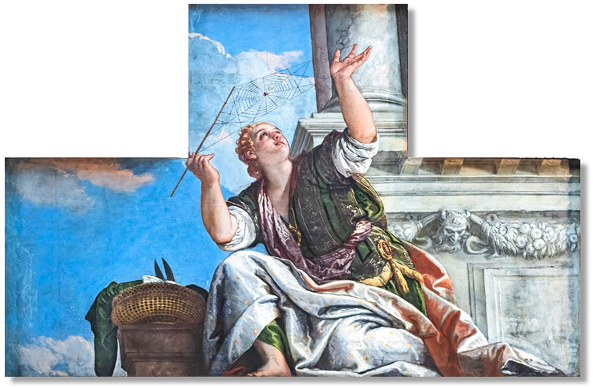 Atenea borda la roca de Marte en la acrópolis y el antiguo diferendo por dar nombre a Atenas. Representa a los doce dioses con sus atributos, a Zeus, como un rey, a Posidón, haciendo brotar el mar e, incluso, se representa a sí misma con su lanza y su casco y teje también la figura de la Victoria. Además, como clara amenaza a la atrevida Aracne, colocó, más pequeñas, en las cuatro esquinas del lienzo, a Ródope y a Hemón, a la madre de los pigmeos, a Antígona y a Cíniras, todos humanos que se hicieron acreedores a severos castigos de los dioses por osar desafiarlos. Si no perdemos detalle, estaremos de acuerdo en que Atenea quiso hacer un homenaje a los dioses y representar su majestad y su poder. Aracne, por su parte, según nos relata Ovidio, representó con su trabajo a Europa raptada por Zeus con forma de toro, a Asteria, sujetada por el dios con forma de águila agresiva, a Leda, violada también por Zeus con forma de cisne y otras muchas arbitrariedades cometidas por él mismo y otros dioses. Aracne mostró al poder y a sus abusos y crímenes en su lienzo.