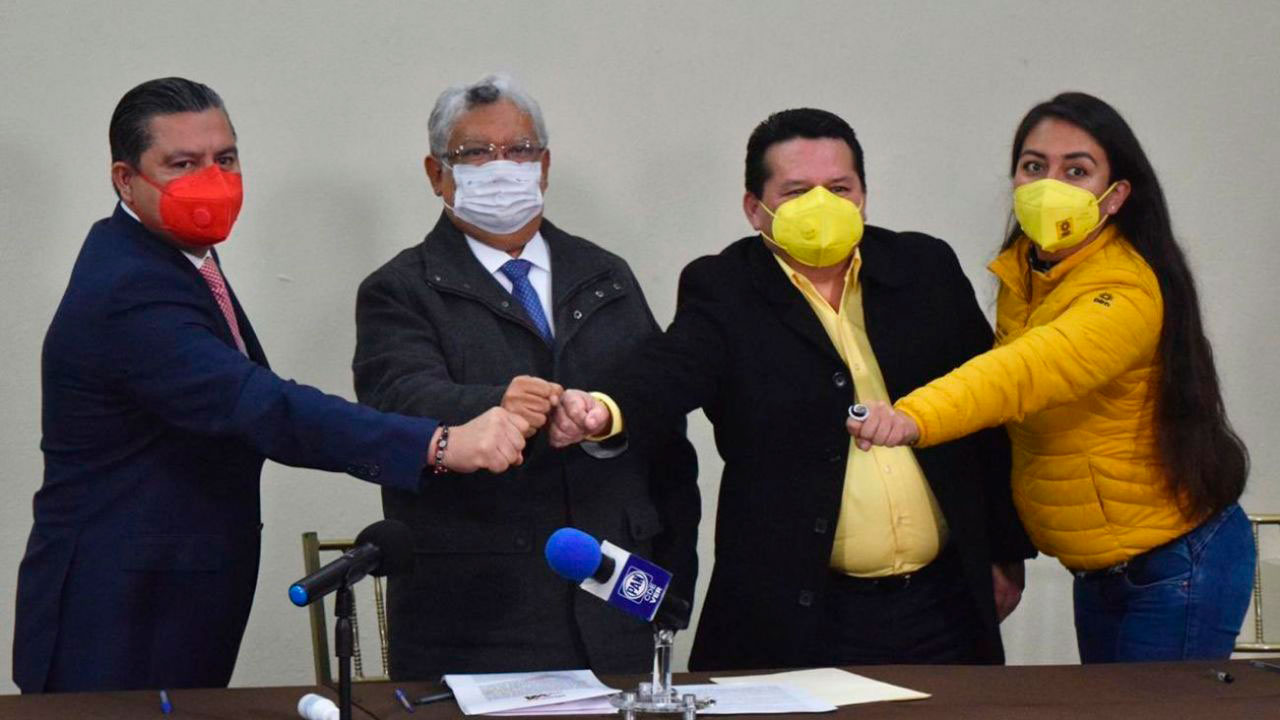 Esteban Ramírez Zepeta, representante del Comité Ejecutivo Nacional (CEN) de Morena; Carlos Marcelo Ruíz Sánchez, dirigente estatal del PVEM y Vicente Aguilar Aguilar del PT afirmaron que su unión electoral se conformó para beneficio del pueblo y no intereses políticos.