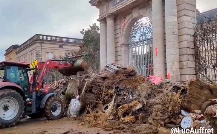 En protesta contra las políticas del Gobierno de Emmanuel Macron y de la Unión Europea (UE) hacia el sector agrícola y ante la falta de respuesta para atender las demandas, agricultores se manifestaron este martes en la sede administrativa del departamento de Lot y Garona, en Agen, Francia, dejando estiércol y demás desechos en la entrada del edificio.