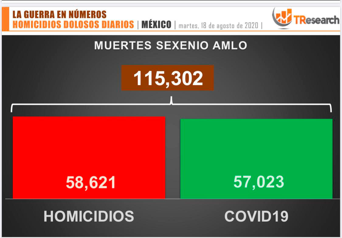 Durante los meses de gobierno de Andrés Manuel López Obrador suman 115 mil 302 muertes, de los cuales 58 mil 621 son por homicidio y 57 mil 23 por Covid-19, según el seguimiento que realiza la consultora TResearch.