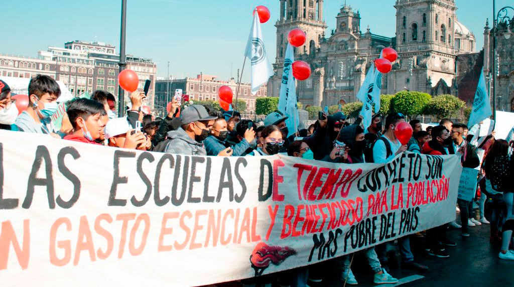 Desde Palacio Nacional este jueves miles de jóvenes adheridos a la Federación de Estudiantes Revolucionarios “Rafael Ramírez” protestaron con cartulinas y lonas en mano, en contra de la desaparición del Programa de Escuelas de Tiempo Completo (PETC), así también exigieron regrese dicho programa que beneficiaba a 3.6 millones de niños y jóvenes al brindarles educación de calidad y alimentación.