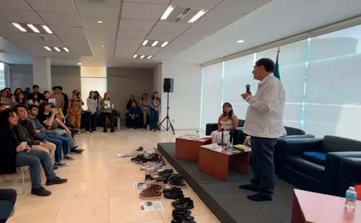 El evento, titulado "Las reformas desde la izquierda", comenzó con una protesta simbólica en la que los estudiantes colocaron zapatos frente al presídium, en alusión a las víctimas del “campo de exterminio”; ante ello, Noroña respondió: “ahí están mis zapatos, y esos no son de un desaparecido. Aquí estoy, haciendo frente a esta reunión”.
