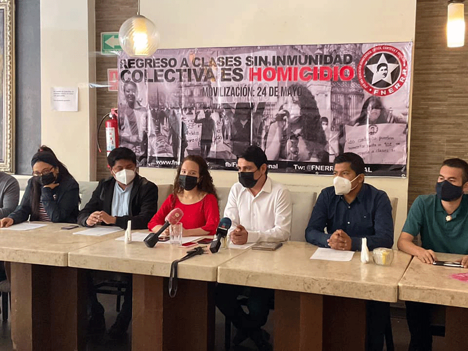 La FNERRR denunció al Gobierno Federal, la Secretaría de Educación Pública y la Secretaría de Salud por la pésima gestión de la pandemia en nuestro país y por la decisión del gobierno de López Obrador, apoyado por las instancias antes mencionadas, de implementar el regreso a clases presenciales aún sin contar con la inmunidad colectiva a raíz del lento avance del proceso de vacunación