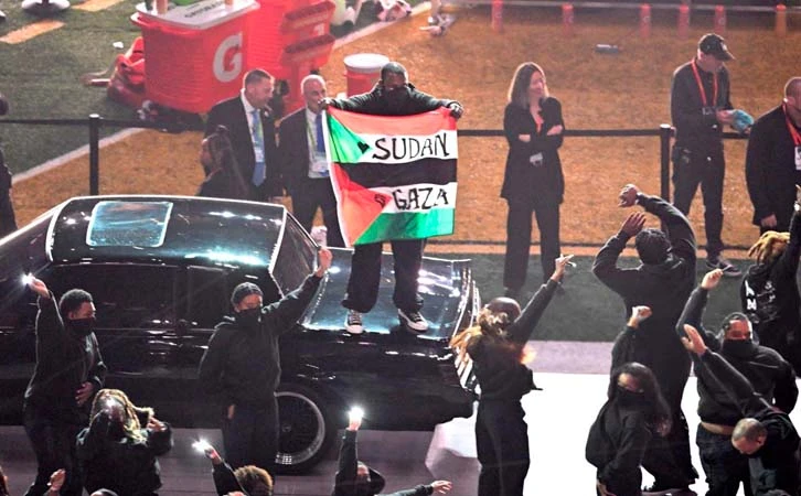 Un hombre con una bandera palestina, con las palabras "Sudán" y "Palestina" escritas, interrumpió el espectáculo de medio tiempo del Super Bowl LIX de la Liga Nacional de Fútbol Americano (NFL), realizado el pasado 8 de febrero en Nueva Orleans, Estados Unidos.