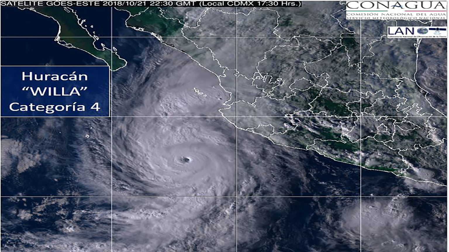 Ciudad de México. – Por la tarde de este domingo, el huracán Willa aumentó la velocidad de sus vientos y alcanzó la categoría 3 en la escala de Saffir-Simpson. Se ubicó a 345 kilómetros (km) al suroeste de Playa Pérula, y a 400 km al sur-suroeste de Cabo. Corrientes, ambas regiones de Jalisco, con vientos máximos sostenidos de 185 kilómetros por hora (km/h), rachas de 220 km/h y desplazamiento al nor-noroeste a 9 km/h, informó el Servicio Meteorológico Nacional (SMN), dependiente de la Comisión Nacional del Agua (Conagua).