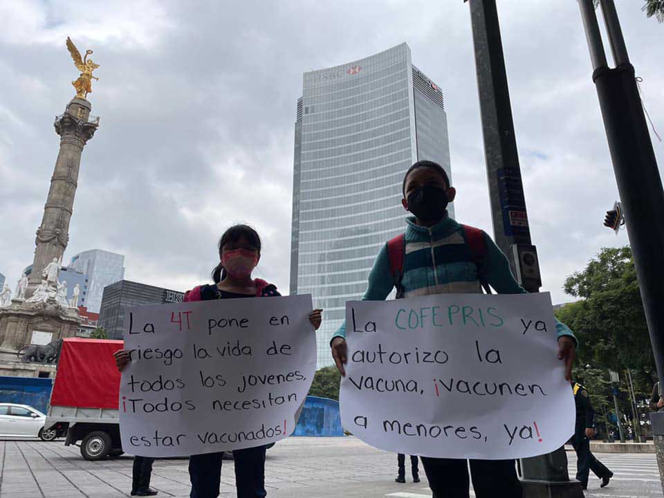 Alrededor de 2 mil estudiantes se manifiestan en diversas ciudades del país de manera simultánea, en exigencia de que se vacune contra Covid-19 a los mayores de 12 años. La manifestación central tiene lugar en la Ciudad de México, donde unos 500 estudiantes realizaron una cadena humana desde el Ángel de la Independencia a La Palma.