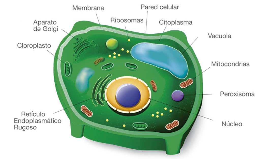 Un ejemplo de célula eucarionte es la célula vegetal, que se compone de distintos organelos que cumplen distintas funciones. Uno de ellos es el núcleo, que se ubica en el centro de la célula. En este compartimento se encuentra la mayor parte de la información genética de un individuo, el ADN (ácido desoxirribonucleico). La membrana plasmática tiene como función proteger a la célula del ambiente exterior, proveer de nutrientes a la célula, expulsar las sustancias tóxicas; además de poseer proteínas que permiten la interacción con otras células. El citoplasma es el medio interior que existe entre la membrana plasmática y la membrana del núcleo, formado en su mayoría por el citosol, cuya función es dar forma a la célula, regular el pH intracelular, promover la síntesis de proteínas, entre otras. El cloroplasto es el organelo que lleva a cabo la fotosíntesis en las células vegetales. La fotosíntesis es el proceso mediante el cual la energía de la luz se transforma en energía química para formar compuestos como la glucosa (alimento de las células), necesaria para la vida de los animales y las plantas. Los ribosomas son macromoléculas complejas, estructuradas por dos subunidades y compuestas por proteínas, éstas intervienen en la síntesis de diversas proteínas que la célula necesita. El citoesqueleto es una red que se forma al interior de la célula para estructurar, organizar y generar movimiento; también participa en la contracción muscular, asociándose con la miosina (proteína fibrosa que permite la contracción de los músculos). La vacuola tiene como función mantener la turgencia, controlar el movimiento de las moléculas, digerir las proteínas y organelos de desecho, almacenar agua, llegando a ocupar casi todo el tamaño de la célula por la gran cantidad de agua que la planta necesita para mantenerse hidratada. El retículo endoplasmático es una red de membranas que se encuentra por todo el citoplasma; su función es sintetizar, almacenar, transportar proteínas, almacenar lípidos y eliminar sustancias toxicas para la célula, como los glucósidos cianogénicos, que se encuentran en las plantas y el principal daño que le causa al consumidor es la destrucción de glóbulos rojos al inhibir el transporte de oxígeno.