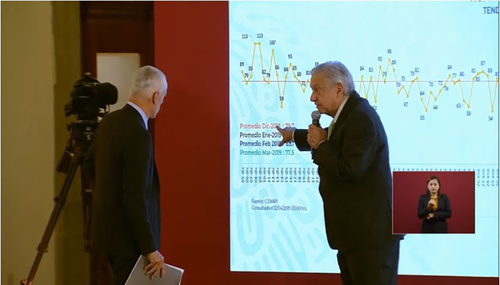 Al ser cuestionado AMLO, como lo ha hecho en otras ocasiones, intentó evadir las preguntas del periodista de Univisión e instruyó a que se proyectara la tabla del promedio diario. Tratando de desviar la atención intentó hablar de otros presidentes: "en dos sexenios perdieron la vida, desde que un presidente declaró la guerra al narcotráfico y le pegó un garrotazo al avispero, alrededor de 250 mil mexicanos..." El periodista, sin embargo, enumeró las cifras de los primeros tres meses de gobierno asegurando que "si sigue así, va a ser (este gobierno) el más violento de la historia moderna de México".