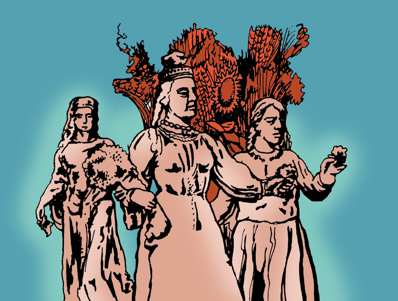 Por ejemplo, la joven de Rusia envuelve espigas de trigo con un brazo; Ucrania usa una corona de girasoles con cintas en la cabeza y flores en una mano; Uzbekistán sostiene algodón; Georgia usa un tocado tradicional, largas trenzas y un racimo de uvas en la mano; Lituania viste un chaleco encima de una camisa, cintas en el cabello y hojas de roble en la mano; Letonia usa un broche redondo en el cuello, joya nacional del país y espigas de trigo en las manos; Tayikistán y Turkmenistán sostienen algodón; Karelia tiene coníferas en las piernas y guirnaldas de flores en las manos; Estonia viste el traje de Muhu, la tercera isla más grande del país; Armenia sostiene racimos de uvas y cubre su cabeza con un pañuelo del que cuelgan monedas en la frente; Moldavia tiene mazorcas de maíz en una mano; Kirguistán usa un gorro tradicional, su cabello cae en muchas trenzas y sus manos tienen flores y algodón; Azerbaiyán cubre su cabeza con un pañuelo de seda y sostiene algodón; Kazajistán usa un tocado con plumas y en una mano espigas de trigo y Bielorrusia, cubre completamente su cabeza con un pañuelo, una manzana en una mano y lino en la otra.