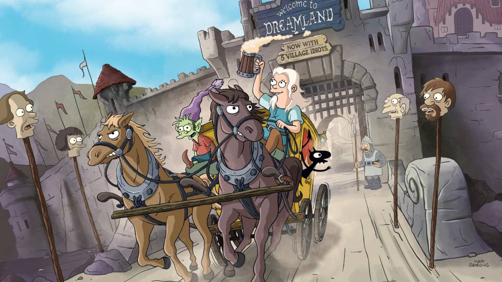 Aunque en su estilo la princesa Bean, el personaje protagonista, sea una prima lejana de Lisa Simpson, las diferencias de (Des)encanto con el resto del universo Groening resultan mayores. La principal es que las aventuras de esta princesa alcohólica junto a un elfo triste y un diablo advenedizo en un reino medieval tienen continuidad entre capítulos, no son episódicas, por lo que resultan perfectas para un maratón en capítulos de 25 minutos en Netflix, plataforma para la que han sido creadas y donde se estrena completa hoy viernes. Él se muestra encantado con el cambio. “Netflix ofrece una nueva forma de narrativa sin cortes publicitarios donde puedo contar historias más largas. A diferencia de Los Simpson o Futurama, en (Des)encanto hay espacio para ralentizar el ritmo sin necesidad de ser mordaz, chistoso o atrevido todo el tiempo”, comenta el autor a EL PAÍS.