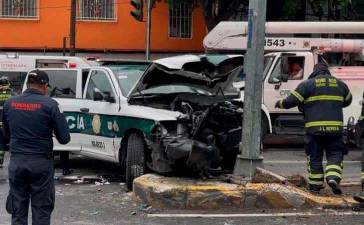 Una patrulla de la Secretaría de Seguridad Ciudadana se impactó con un poste de videovigilancia del C5 en el cruce del eje 5 Oriente Javier Rojo Gómez y la calle Hidalgo, en el Barrio San Miguel, Iztapalapa; en su camino envistió a tres vehículos particulares, siniestro que dejó al menos cuatro personas lesionadas, entre ellas dos elementos de la corporación.