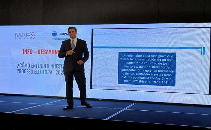 Lo anterior, lo informó Héctor Díaz Santana, exfiscal de la FEPADE, durante su participación en las conferencias tituladas ¿Cómo entender nuestro proceso electoral 2024?, organizado por Confederación Patronal de la República Mexicana (Coparmex) y su afiliado Despacho MAF y asociados.