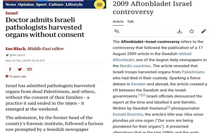 Ian Black, editor del Centro de Medio Oriente y periodista en The Guardian por 33 años, publicaba el 21 de diciembre de 2009: “Doctor admite que patólogos israelíes cultivaban órganos sin consentimiento”. Israel ha admitido que patólogos cultivaban órganos de palestinos muertos, y otros, sin consentimiento de sus familias – práctica que, afirma, terminó en los años 1990 -. La admisión del exjefe del Instituto Forense del país, siguió a la furibunda reacción de Aftonbladet, un medio publicado en Estocolmo, Suecia que en su edición del 17 de agosto de 2009 reveló que tropas israelíes traficaban con órganos de palestinos fallecidos bajo su custodia. Esa publicación causó una controversia en Suecia y el exterior, así como con Israel y autoridades israelíes que calificaron al periodista y fotoperiodista Donald Boström de “anti-semita” por su artículo titulado: “Nuestros hijos han sido profanados por sus órganos”. Un poco después, médicos israelíes admitían que hicieron eso, refirió el periodista británico Ian Black.
