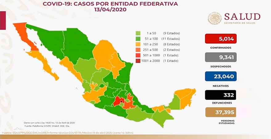 La Secretaría de Salud informó esta noche que los casos confirmados de pacientes con Covid-19 suman 5,014 personas; mientras, los casos sospechosos ascienden a 9,341 y otros 23,040 resultaron negativos. En tanto, son 332 personas fallecidas a causa de la pandemia.