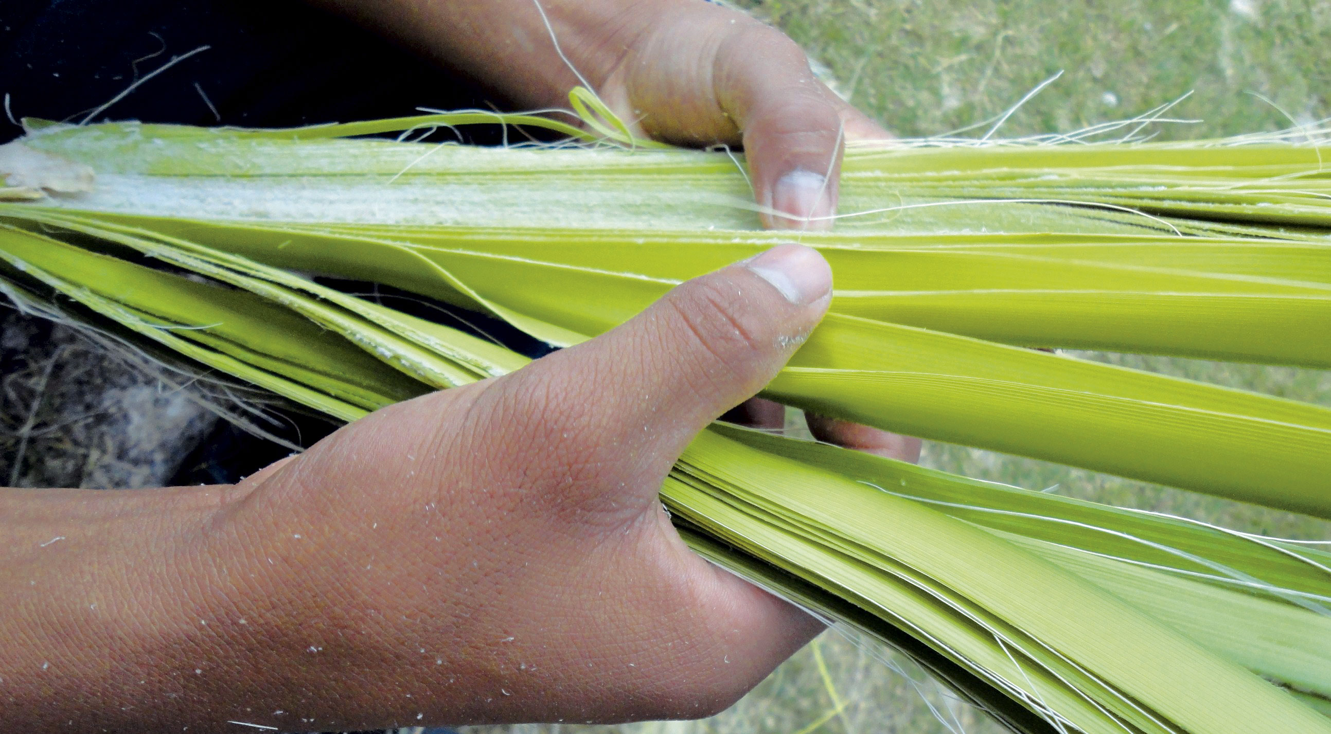 La elaboración de un sombrero, por ejemplo, comienza con la raja de la palma con una aguja o con las uñas; de la parte blanda se sacan las tiras mediante su “rasurado”, es decir, se retiran ambos bordes y enseguida empieza su tejido en la copa con el entrelace de las numerosas tiras de palma característico de esta prenda.