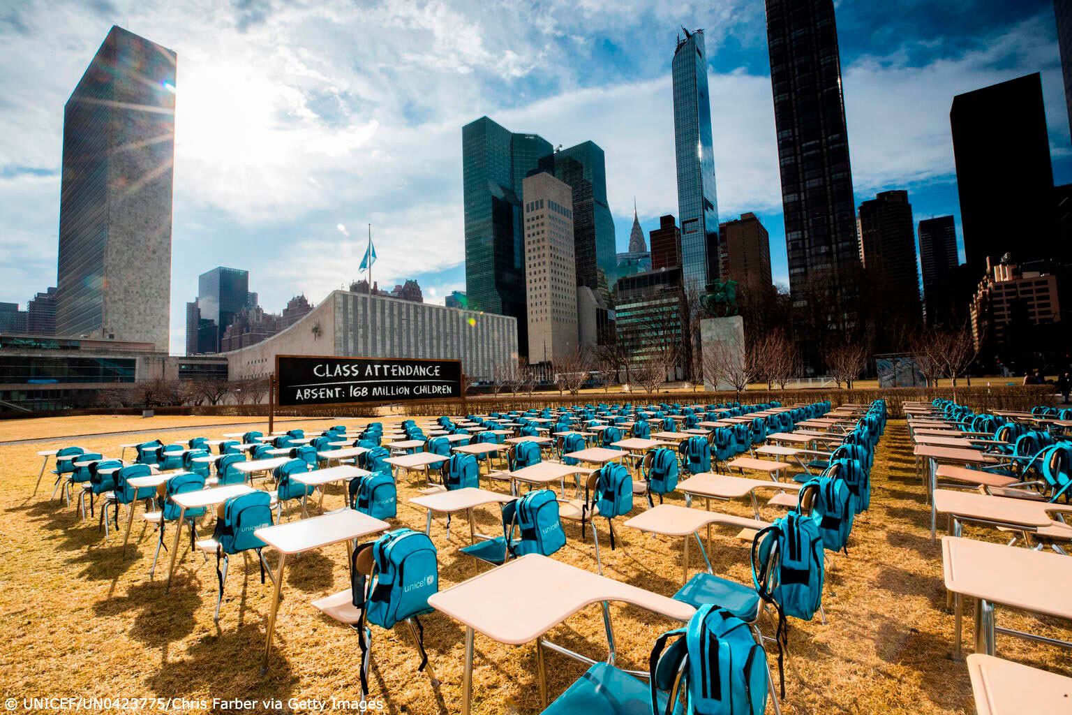 “68 asientos vacíos, 168 mochilas sin usar, 168 millones de futuros en juego”, es el mensaje que la organización con una representación de un aula, pero sin ningún niño ni niña, en su sede en Nueva York.